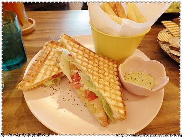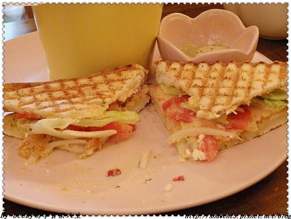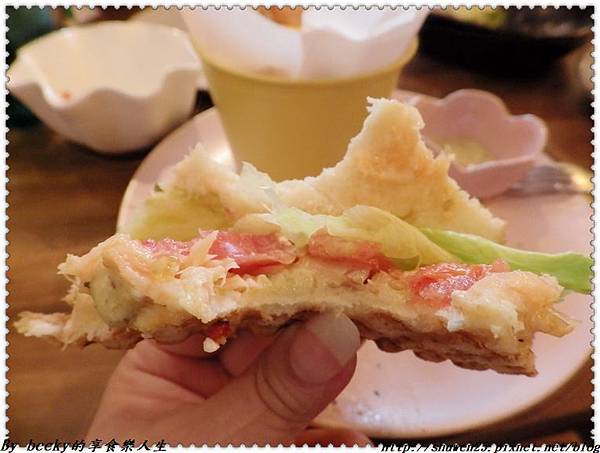 裡頭有著煙燻鮭魚、蕃茄、萵苣、費達起司,搭配上羅勒橄欖油與蛋白醬,熱騰騰的外酥脆麵包與裡頭各種層次新鮮口感,在口中組合有著溫和的樂章,越咀嚼越有香氣,而鮭魚的味道很顯注與蛋白醬混搭,散發誘人的魅力,也是一道好吃的餐點。