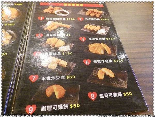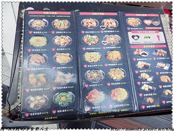 一入座後服務人員會先送上菜單,上頭有21種的創意丼飯可以選擇,單點丼飯附有味噌湯和生菜沙拉(可續),也可以加80元升級成套餐或是單點其他炸物。