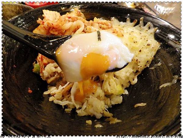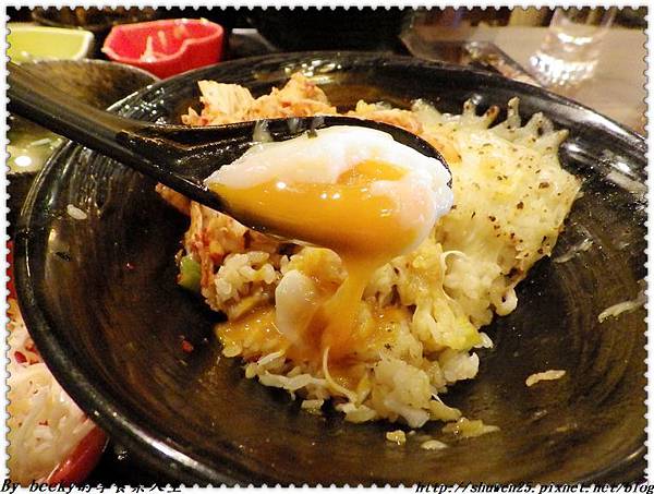 而主食韓美新丼就是韓式泡菜搭配美式起司的丼飯~上頭還有一顆生雞蛋,熱騰騰的起司與蛋一直都是很完美的搭配組合!