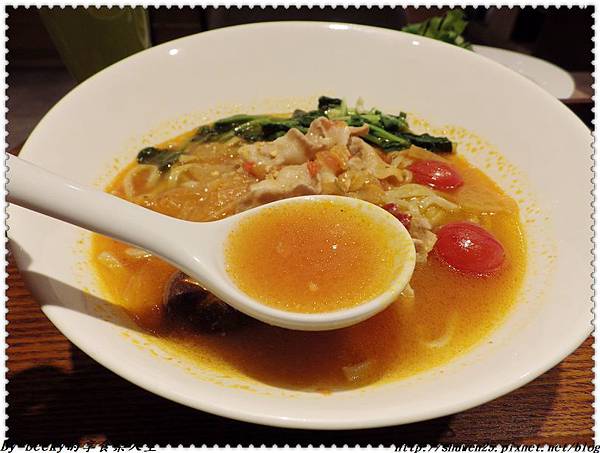 酸辣豚肉麵的湯底是用白菜、高麗菜、白蘿蔔、蕃茄及辣椒自然發酵而成,所以酸湯是帶著蕃茄的酸、還有辣椒的辣,所以喝起來酸酸又微辣感。