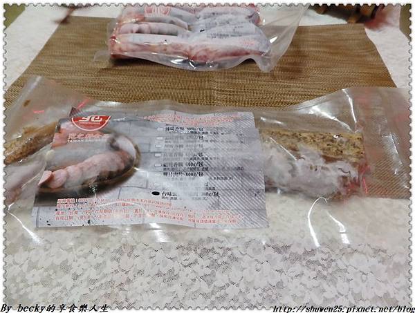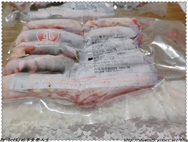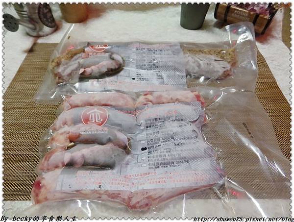真空包裝的香腸及鹹豬肉,須要冷凍~正面有著產品名稱及訂購資訊。