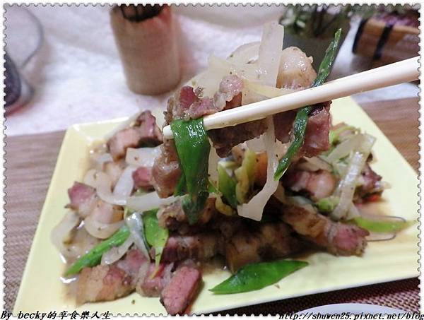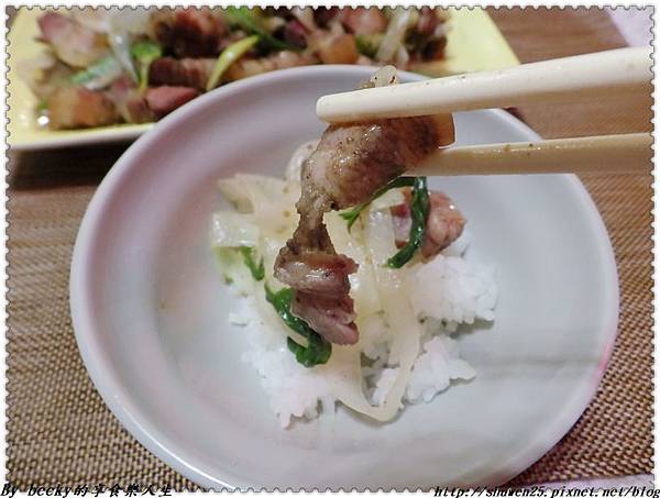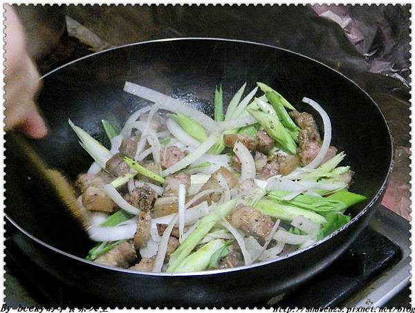 等每一塊鹹豬肉半熟後,油脂釋放出來,再放入蒜及洋蔥繼續翻炒,很快的台味鹹豬肉就完成了。