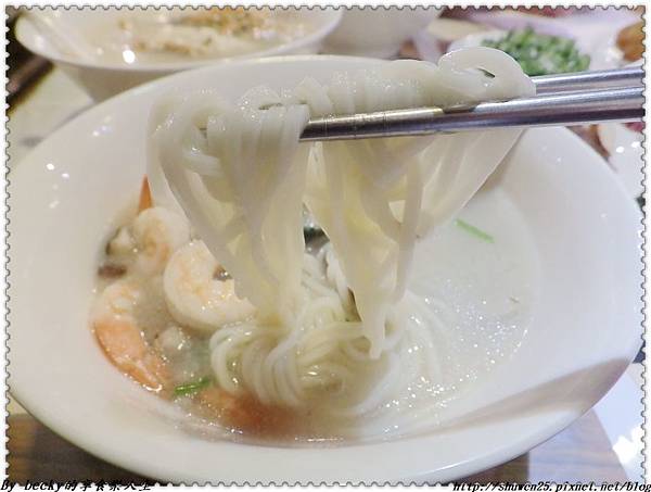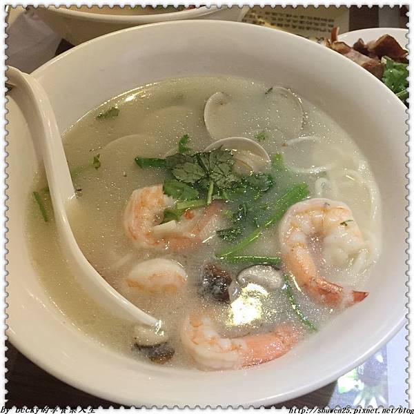 這碗有鮮蝦、蛤蜊,濃郁的湯頭中泛著海鮮油脂,裡頭還灑上少許香菜來添加香氣,讓食指大動呢!
