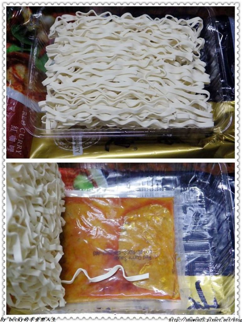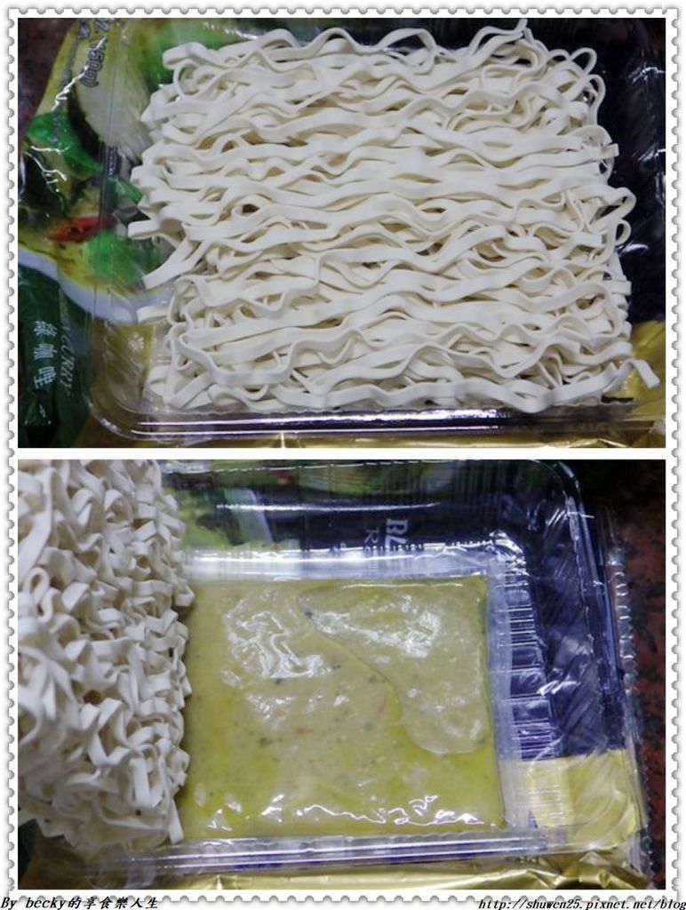 剪開小包裝,裡頭是一份日曬手工關廟麵條及一包紅咖哩與綠咖哩醬汁。