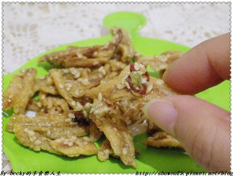 這是海港產季直送新鮮食材,獨門配方經煮料、拌料、烘烤等多道工法而製成的香配脆的海鮮好滋味,丁香魚片酥脆口感,配上無油炸的烘烤,上頭有著白芝麻及蔥片混合,入口咀嚼有著微辣及脆香好味道。