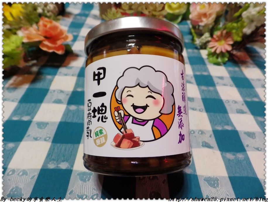 先來看原味豆腐乳~外瓶有著古錐媽媽圖案,因是原味,所以用白色底方式呈現,而甲一塊豆