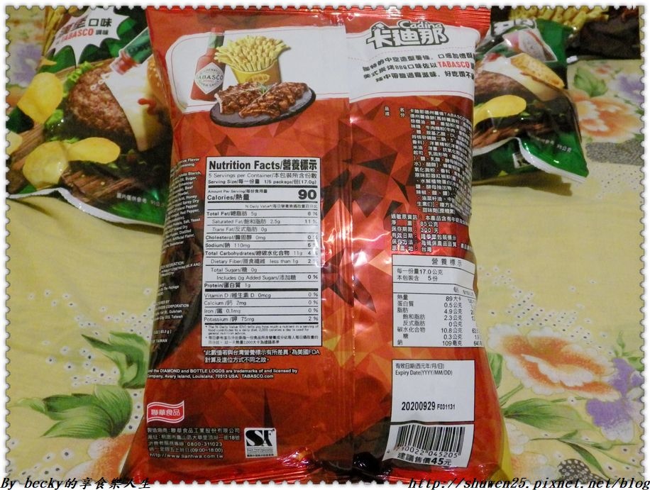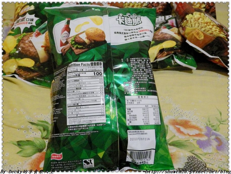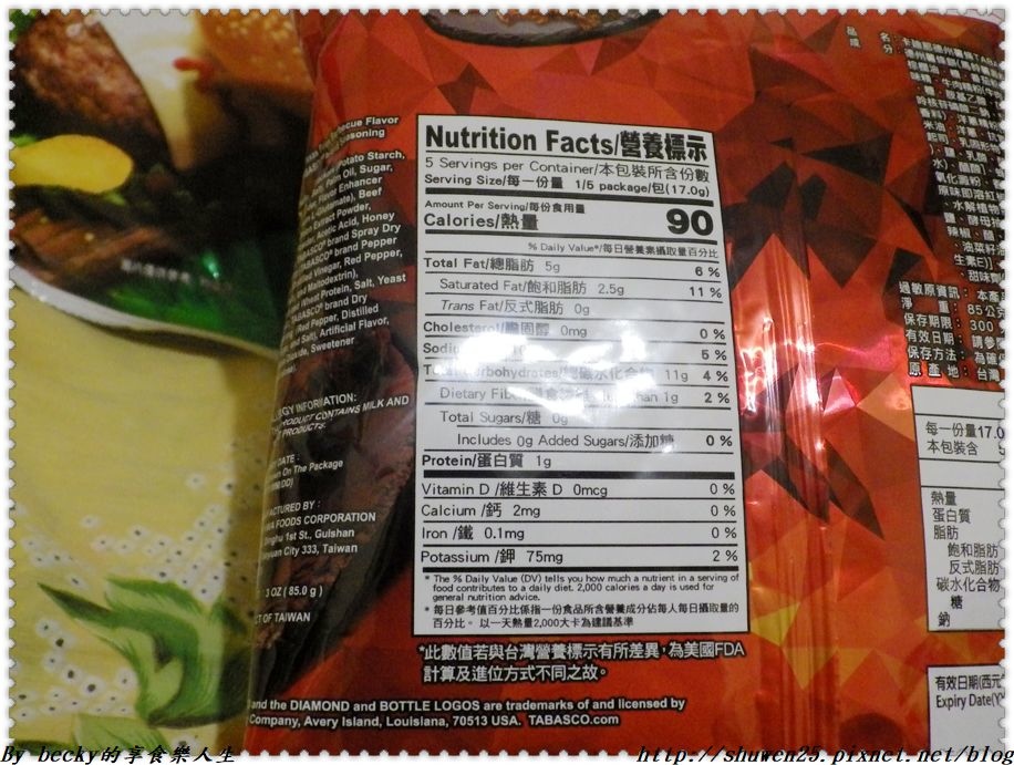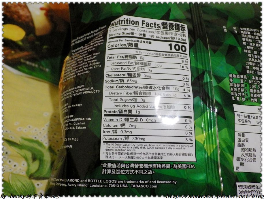 背後則是TABASCO 調味漢堡口味洋芋片各種資訊~有品名、成份等資訊。