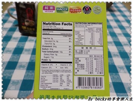 背後則是有產品品名、成份及營養標示,重要的是是台灣製造。
