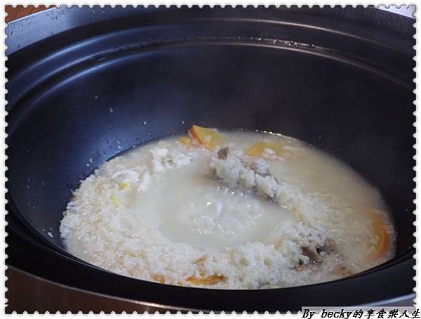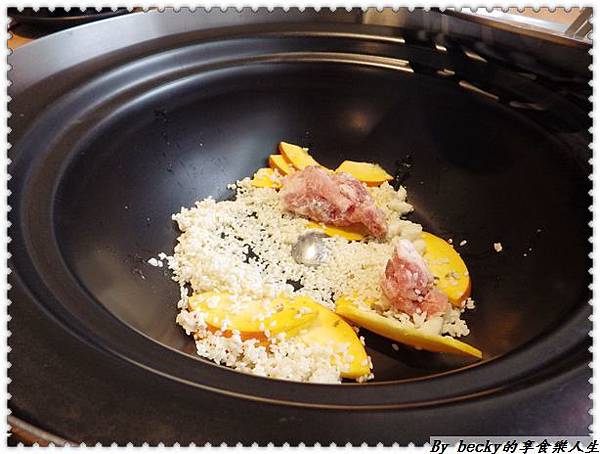 所有的食材都已蒸煮完畢,底下的金瓜排骨粥已經熬煮完成,還可以看到完整的金瓜及排骨呢!