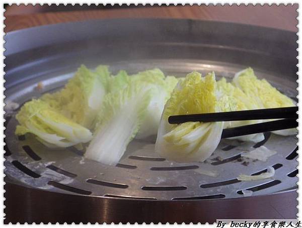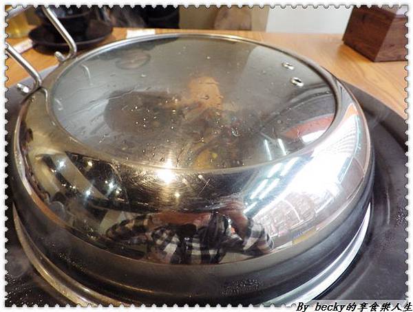 店員先來把蒸的板子拿起,把粥品的食材放入鍋中,用蒸氣產生的水份來熱煮食材,我們選擇的是金瓜排骨。