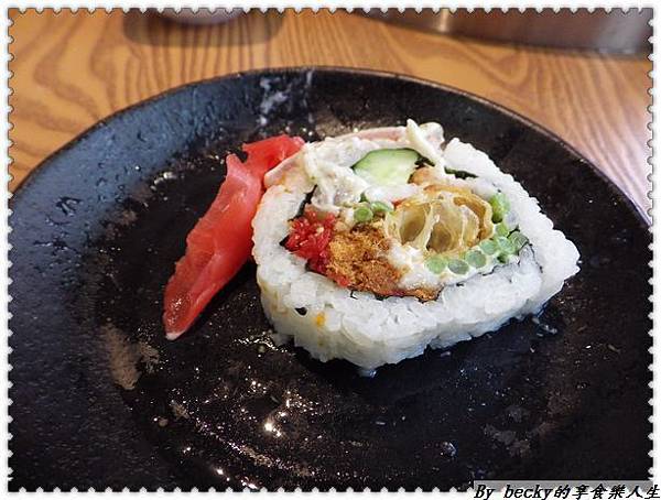 沒錯看起來非常豐盛的花壽司,上面淋有沙拉醬,吃起來不會感到油膩,壽司裡面有著蘆筍、蟹肉、肉鬆、小黃瓜及油條等等。