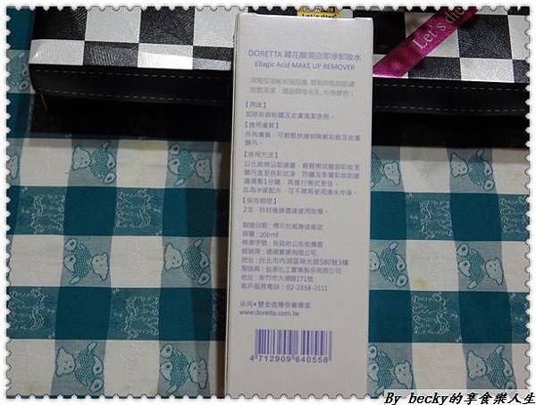 旁邊有著DORETTA鞣花酸潤白即淨卸妝水四大保證不含酒精、防腐劑、色素及合成香料。
