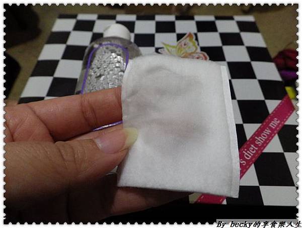 也是一樣把卸妝水倒在化粧棉上,先擦拭了一邊的臉