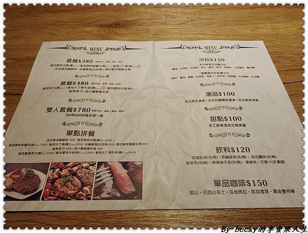 這是菜單有380元套餐、480元套餐,當然也有雙人套餐780元,可選擇380元,搭配480元的組合,非常划算,套餐都有主餐的附餐,沙拉、湯品、甜點和飲料,除了套餐,當然也有單點,皆需加收一成服務費。