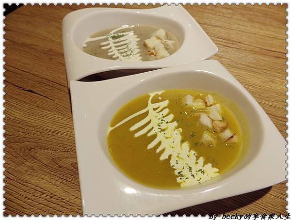 首先是濃湯今天是南瓜濃湯、松露蘑菇濃湯。