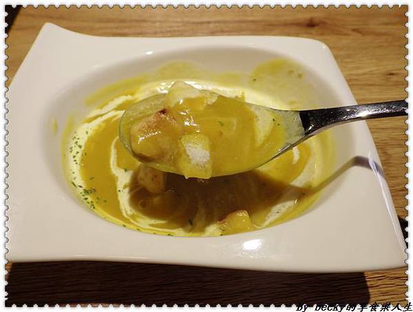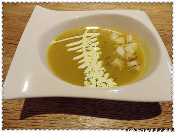 南瓜濃湯用奶油點綴,看起來非常濃郁美味,入口散發出自然南瓜甜味,非常濃郁滑順,裡頭的麵包塊帶點鹹甜味,整個非常溫醇順口。