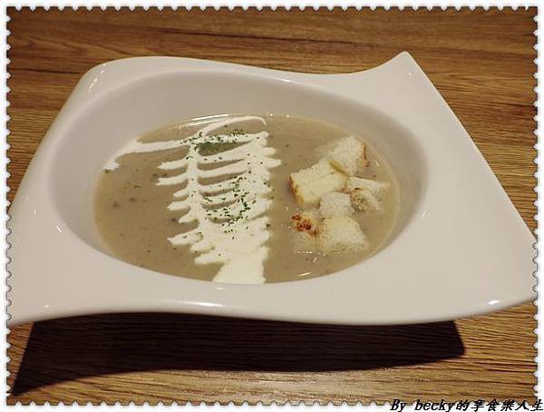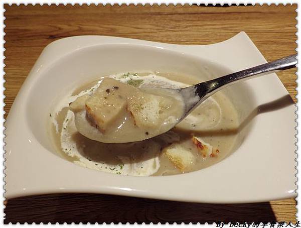 松露蘑菇濃湯也相同用奶油裝飾,喝起來有著濃厚的松露香,還帶有微鹹口感,與麵包塊也非常搭喔!