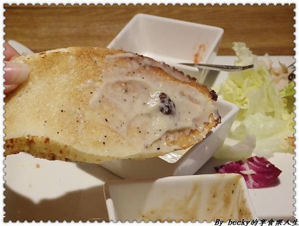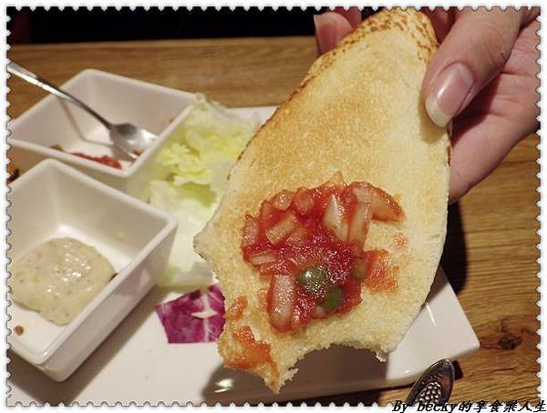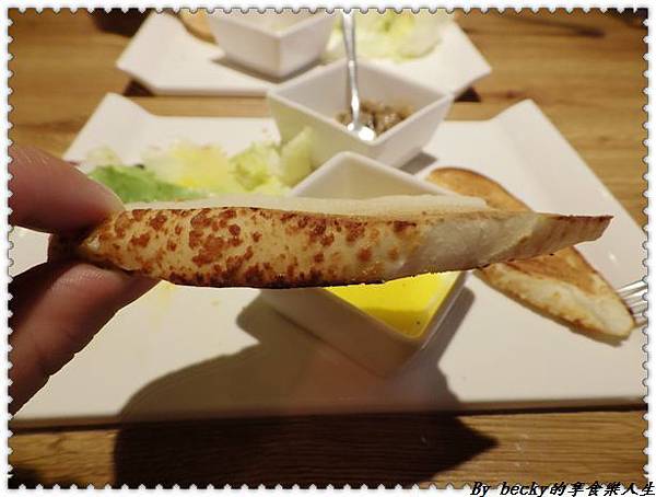 麵包單吃就很酥脆又有微甜鹹香氣,凱薩醬有著濃郁香氣,莎莎醬有點辣味,入口非常有味道。