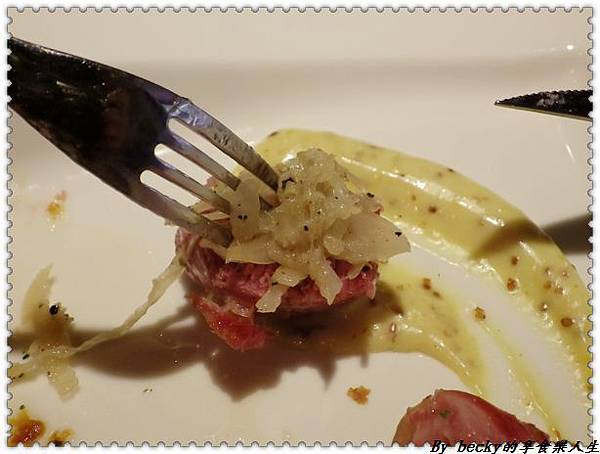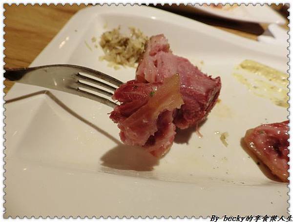 而旁邊則是酸菜及芥末醬,搭配著吃,可以讓豬肉更有豐富的味道,微酸甜滋味,讓人一口接著一口吃個不停。