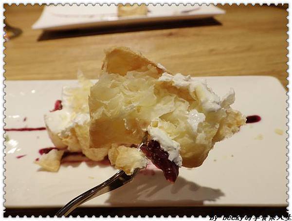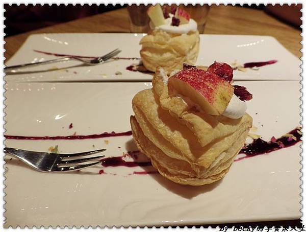 手工製的千層派有著酥脆香味,上頭有著鮮奶油與蘋果丁,灑上少許的糖粉,再搭配藍莓醬與香氣十足的玫瑰花瓣,吃起來有著奶油香酥酥脆脆口感,微微甜香口感,讓整個甜點有著非常完美,當做最後的END。