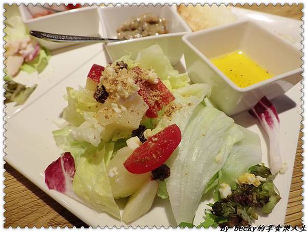 這個是生菜搭配著水果—蘋果、番茄、鳳梨丁等水果,再灑上碎的鹹蛋黃與蛋白增添其味道,吃起來微鹹帶有沙沙口感,而將油醋醬淋在生菜沙拉上,酸酸甜甜的口感,帶有百香果香味道,很清爽也開胃。