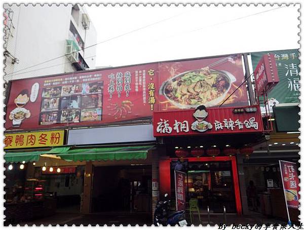 雖然冷冷的天氣吃個麻辣鍋是很過癮的事,不過第一次聽到有乾的麻辣鍋,這個就必須要來滿足一下口腹之慾,這次來到了蘆洲的福相麻辣香鍋,是正統的川式干鍋,這次就來品嚐一下不同的麻辣鍋。福相麻辣香鍋臨近蘆洲佳瑪以及傳統市場附近,還蠻熱鬧的,今日到時還下著濛濛的雨,很適合吃鍋喔!紅色的招牌非常顯目,這裡還有七種等級的辣度讓人挑戰呢!
