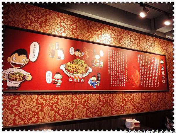 進到店內有著古色古香的味道,連牆上也是紅通通一片,但卻不會有相違感,一邊的牆壁有著麻辣香鍋的由來。