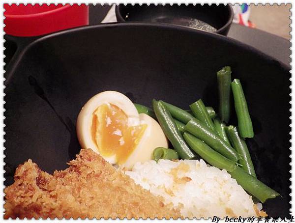 這裡是咖哩醬汁與飯及豬排分開置放,而配菜則是四季豆及溏心蛋。