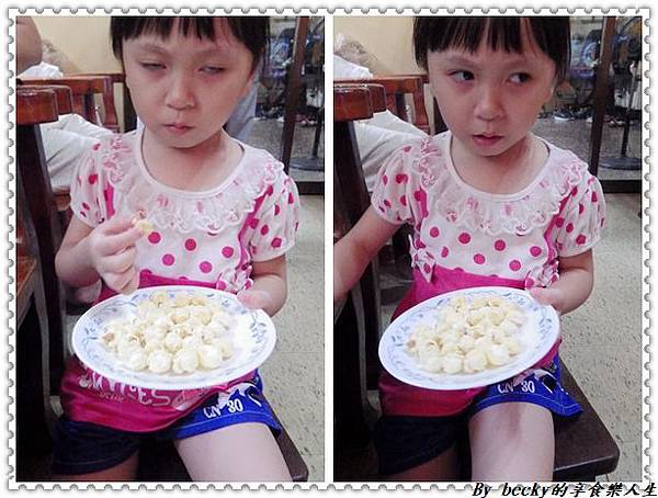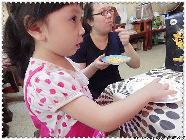 倒到盤中,可以看到一顆顆圓形的爆米花,這是使用美國進口精選非基因改造玉米粒,再加上人工爆炒,拿一顆口入,口感爽脆,帶有濃厚的玉米濃湯香氣,咀嚼後有著甜甜鹹鹹口感,非常好吃~除了我以外,小妹兒也吃的很高興~一口接著一口吃著。