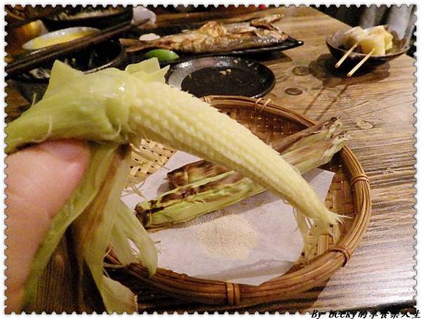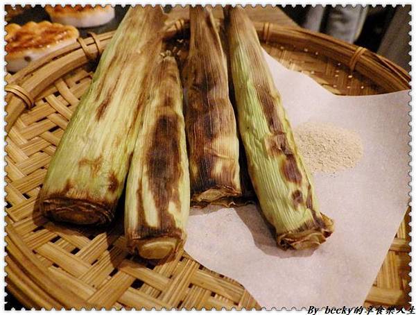 沒錯這個是帶殼去烤的,旁邊還附有胡椒鹽;剝開後可以看到很漂亮的玉米筍,咬一口非常脆香又清甜,吃原味就很好吃。