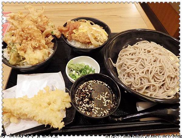 這次選擇的是W炸海老蕎麥麵/炸蝦2隻(熱)+櫻花蝦野菜天丼+腰內豬排&炸雞塊丼;天氣熱,所以選擇了乾的蕎麥沾麵