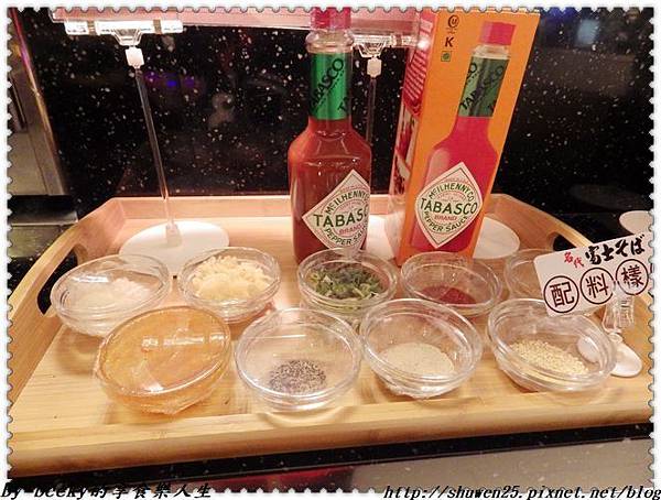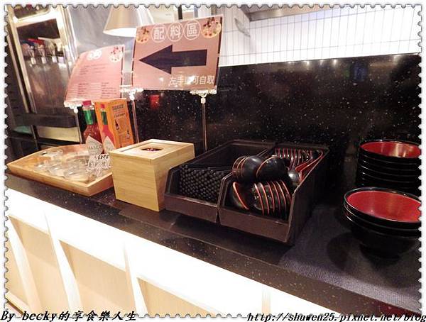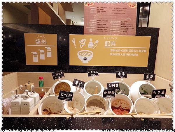 這一區是醬料配料區,可以依自己喜好來添加,在上面有標示餐點可以加些醬配料提味,另外,也有免費提供蕎麥湯喔!
