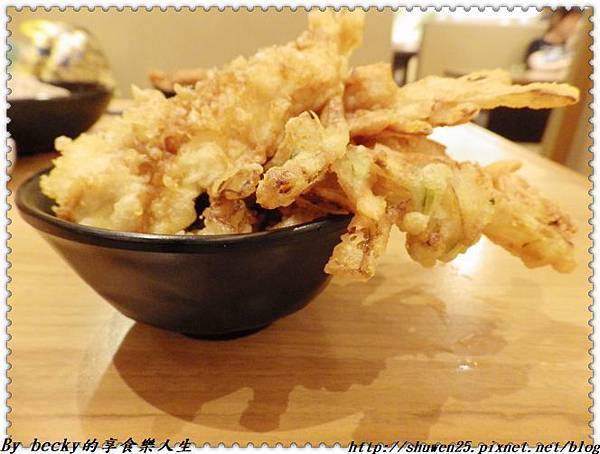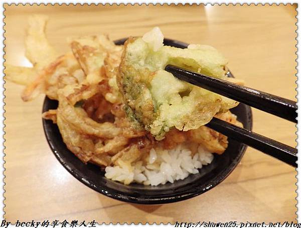 一整個大塊是櫻花蝦野菜天丼,裡頭有著櫻花蝦、洋蔥、切碎的芹菜,咬起來有著洋蔥的甜味及香氣,櫻花蝦的口感很細膩、有鮮味,在嘴中咀嚼香氣十足。