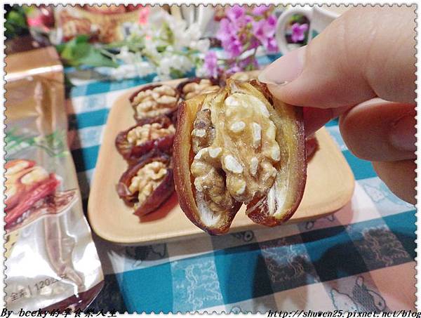 而120g大包裝的椰棗核桃每一顆大小也是相同,咬一口核桃的香氣及脆度與椰棗的甜味融合於嘴中,果實的自然甜香味與核桃清爽脆實感,整個在口中香氣十足,老爸很愛這個口感及味道,很適合當看電視時的零嘴!