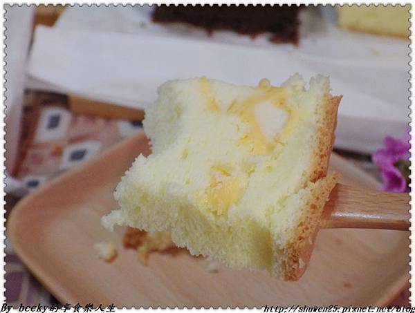 起司派對古早味蛋糕是雙層起司加上滿滿的乳酪丁可以看到很多起司呢!