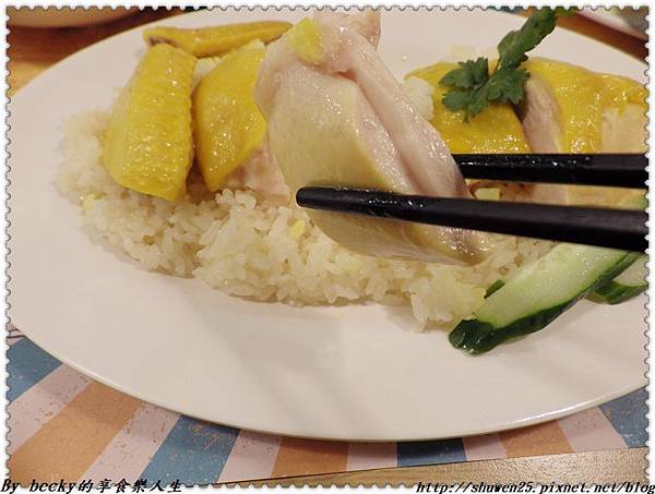 很簡單的菜色及擺盤有海南雞、白飯、小黃瓜及蕃茄;先舀一匙飯,這是清雞油飯,白飯淋上雞油,帶著微鹹及香味道,單單吃白飯也很美味。
