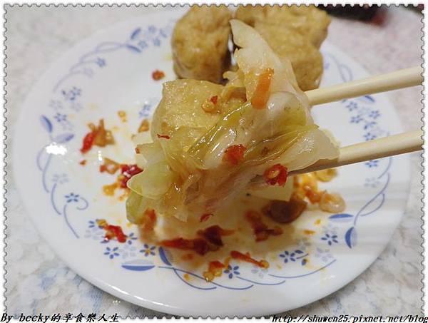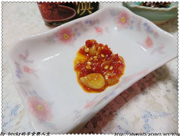 酸辣椒的味道帶點酸味,裡頭有添加鎮江醋,還有蒜頭嚐一小口,有著微香辣感,這個辣是屬後勁。
