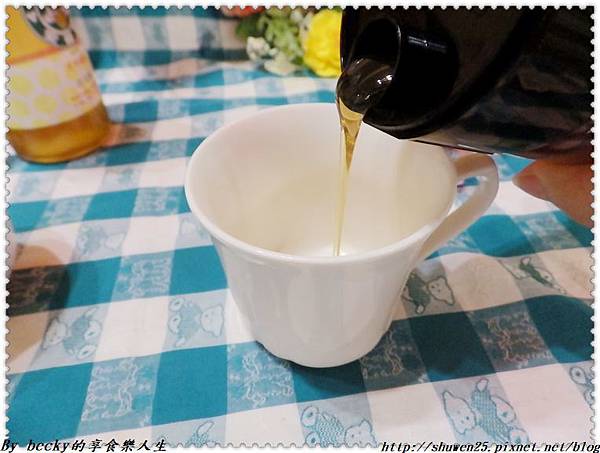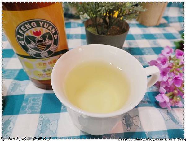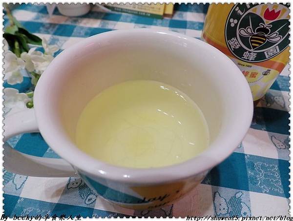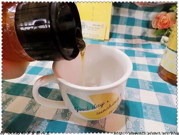 百花蜜倒入杯中,有著濃厚花香,沖冷開水後,可以看到略濁的蜂蜜水。
