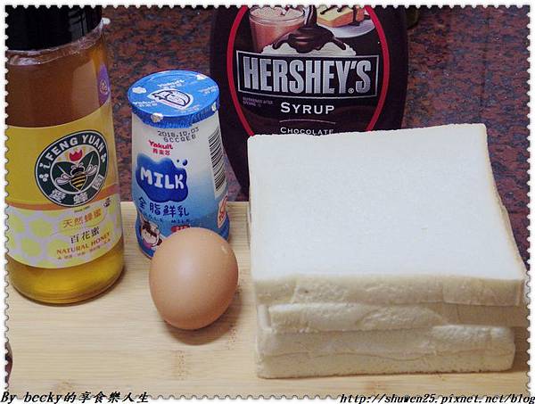 材料:土司二片、牛奶少許、雞蛋一顆、巧克力醬取代花生醬、百花蜜。