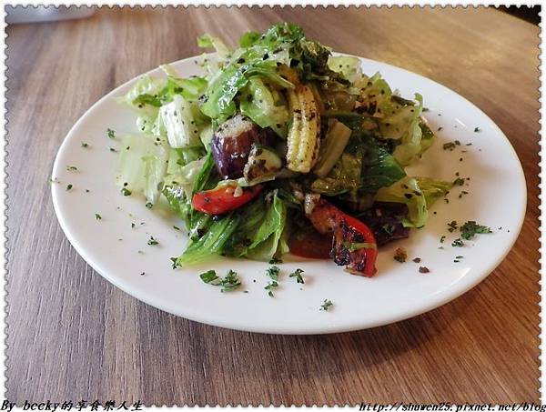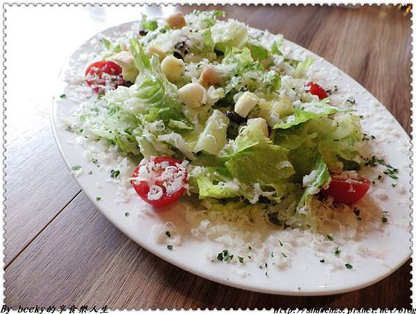 這道凱薩沙拉本來是用美國蘿蔓,不過近期美國蘿蔓有些問題,所以店家改用台灣蘿蔓、蕃茄、麵包塊、葡萄乾及Parmesan cheese,而上頭淋上的店家調製的Sauce。
