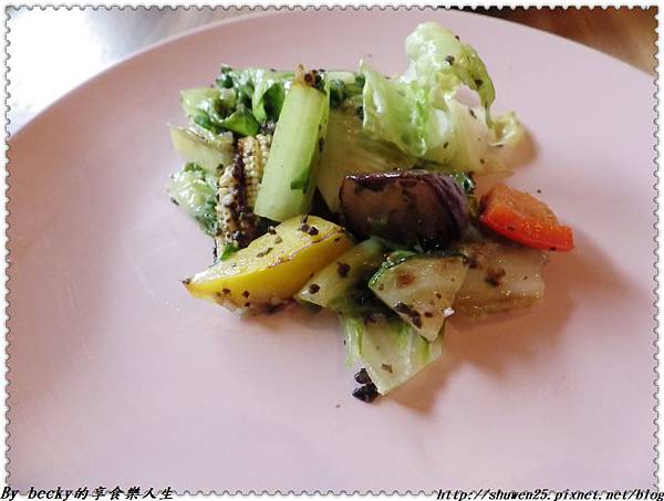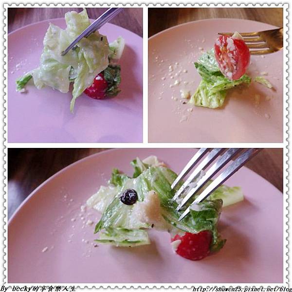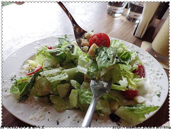 攪拌後,舀一些到盤中,蘿蔓及蕃茄清脆有水份,因為有大蒜調的Sauce,所以味道厚重,與cheese微鹹搭配口感,非常新鮮爽口。