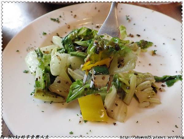 裡頭有玉黍筍、茄子、甜椒、節瓜及蘿蔓;用松露醬及大蒜去翻炒後,上桌前再加上一些義式香料,吃一口,有著黑胡椒香及蒜辣香,新鮮帶有水份的蘿蔓、甜而脆的甜椒及節瓜、玉黍筍,整個入口有著鹹香,多種時蔬層次濃郁口感在嘴中久久不散。