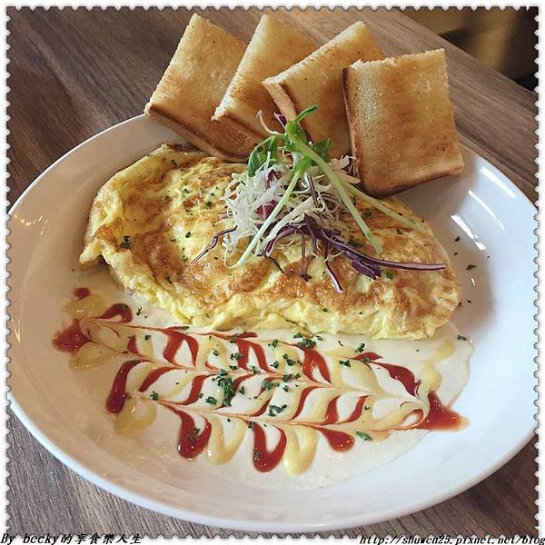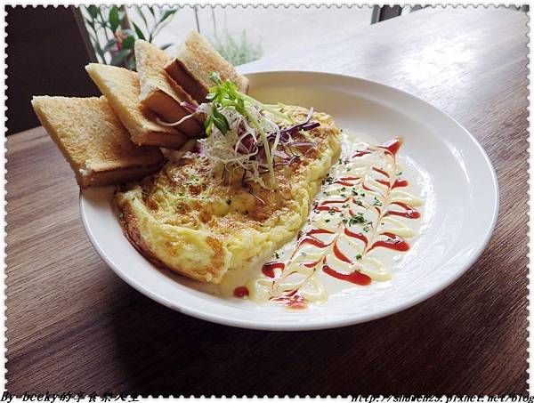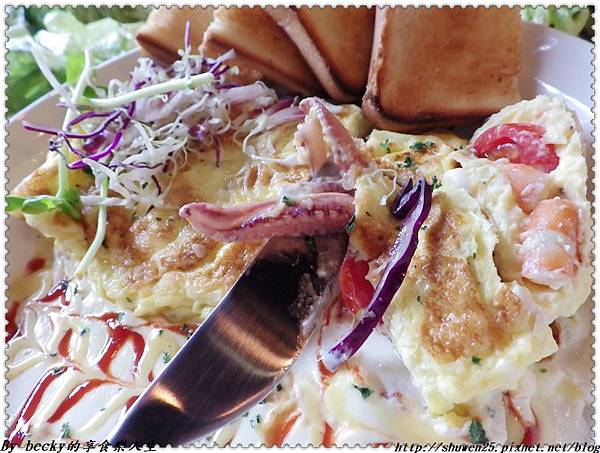 這個歐姆蕃茄海鮮蛋捲附有麵包塊、旁邊的Sauce是蕃茄醬、芥末醬及起士醬;而所有的食材都包覆在蛋裡頭。