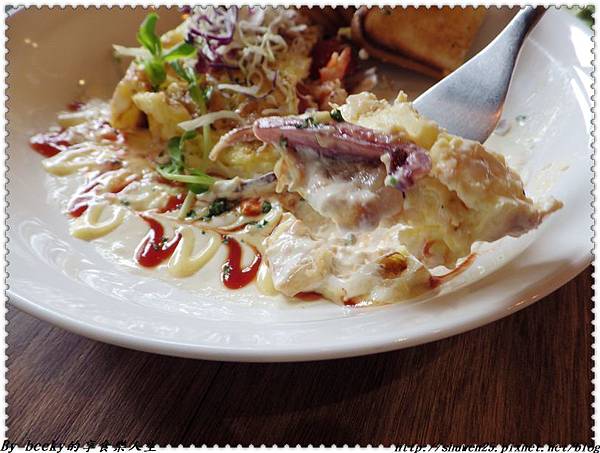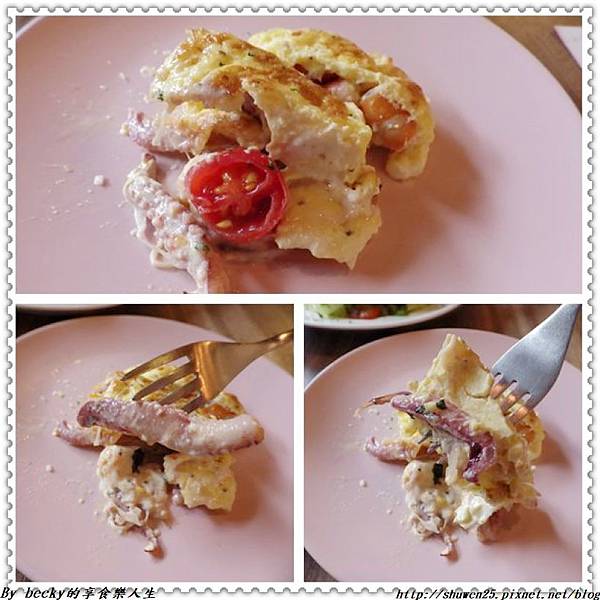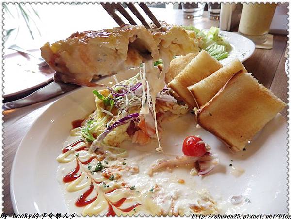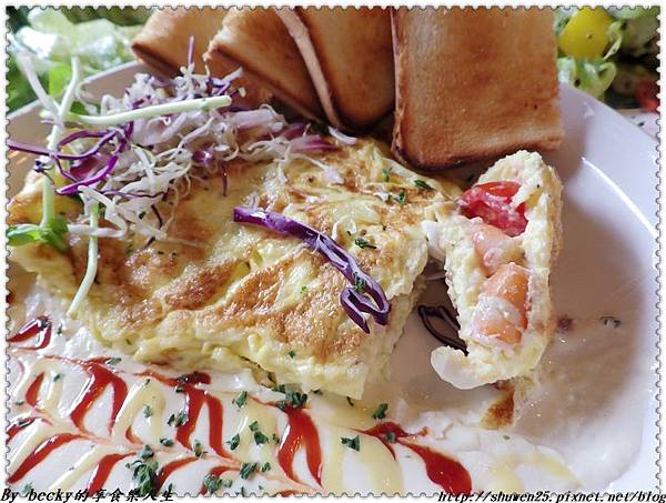 舀一些歐姆蛋捲,非常柔軟,因有起司,帶些奶香味,裡頭蕃茄有水份,蝦子Q彈,而咀嚼很有嚼勁,而切碎的洋蔥帶著甜味,整個吃起來非常有味道。
