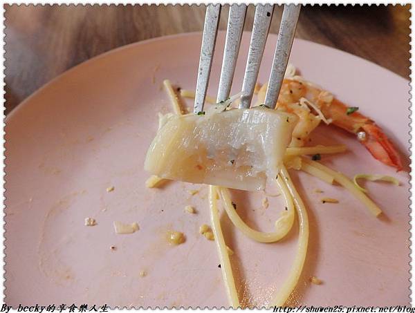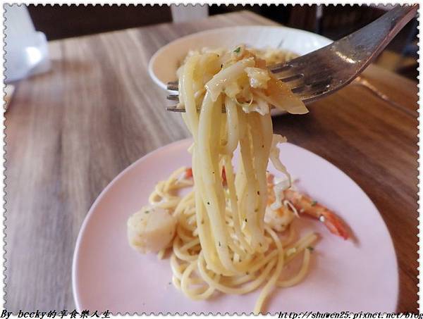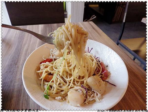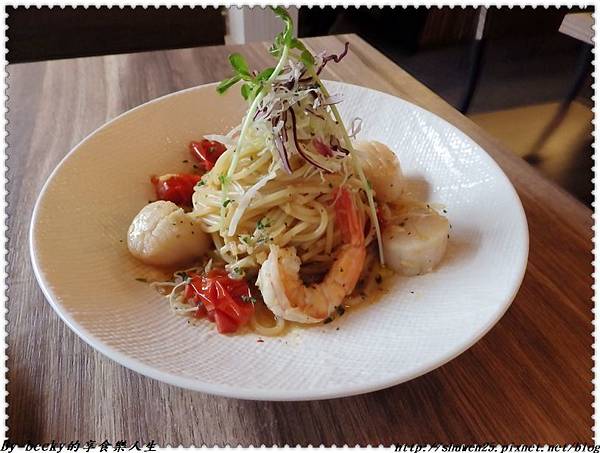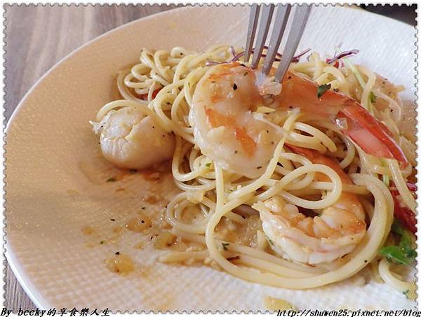 吃一口麵條,Q彈帶有青檸香;干貝則是軟嫰帶著甜味;蝦子則是去殼,入口有彈性鮮甜,雖然是有添加義式香料,不過味道卻是屬清淡,這道麵食也好吃。